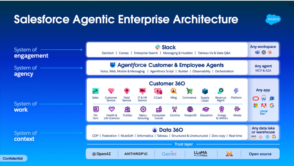 Salesforce’s unique four-system architecture addresses those constraints in sequence. Context establishes shared business and customer data. Work turns that trusted data into reliable execution. Agency allows AI to scale that execution intelligently. Engagement brings humans and agents together so the system can operate in real time.