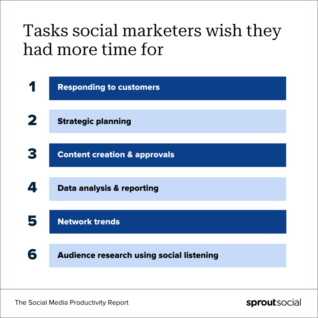 According to the 2024 Social Media Productivity Report, nearly half (48%) of social media marketers feel they sometimes or rarely have enough time to get their work done. If they had more time, they’d spend it responding to customers and planning strategic initiatives.