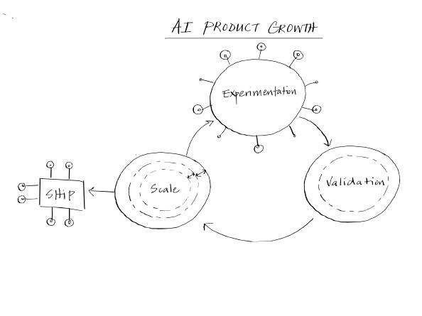 At the top is a massive circle of experimentation, where you can explore a wide range of possibilities. This is where you work with teams across the business — marketing, sales, support, and beyond — to understand their challenges and identify potential AI use cases. The key is to run many small experiments, fail fast, and learn quickly.