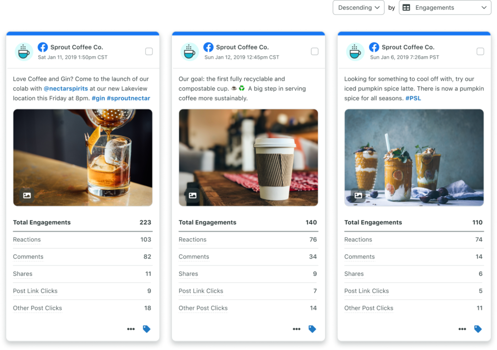 Side-by-side analytics for three Sprout Coffee Co. Facebook posts published in January 2019