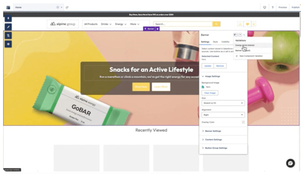 Commerce Cloud makes it easy to personalize content experiences, promotions, products, and more by using data streams. A data stream is any and every bit of information that’s funneled into Salesforce from around your business. This includes behavioral events like every click, search, add-to-cart, and more. Commerce Cloud’s intuitive consoles make it easy to see all of these data points and attributes, and use them to create customer segments. Once you make a segment, you can use drag-and-drop tools to build personalized experiences (like the hero banner below). Now, you can ensure that every interaction is contextually relevant and engaging.
