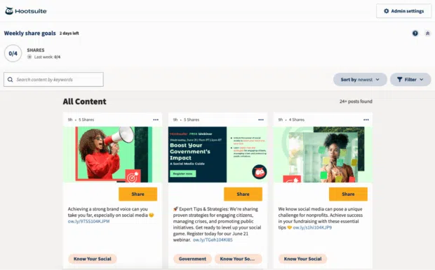 Amplify also has built-in approval processes and controls, which makes it super easy to make sure everyone follows your social media guidelines. And since it’s part of the Hootsuite social media management platform, you can boost and track all of your social engagement in one place.