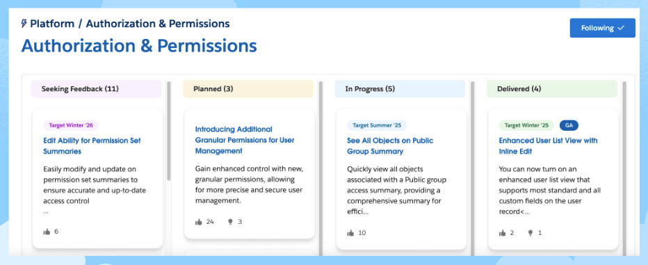 - Product Management Engagement: Salesforce product managers monitor RoadmapExchange to gauge community support and understand the nuances of the features they’re planning. They may reach out to you as a follow up on your feedback. This closed loop helps refine features or prioritize implementation details, ensuring that the final product meets the needs of our users.