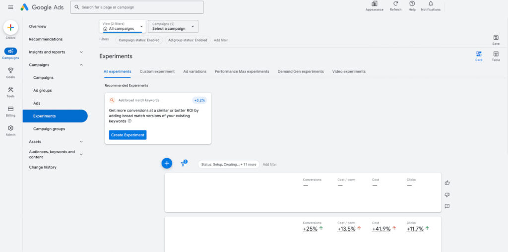 As you will see, there are many other experiment options, including Performance Max and Video, should you wish to test them, too.