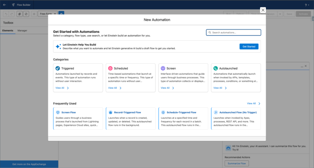 The process of starting a new flow just got a major UX upgrade. With the new “Create New Flow” modal, users get a streamlined, intelligent experience when launching into Flow Builder. You can access this directly from Setup as well as in the Automation App. This modal helps users identify the right flow type with smarter filtering, search capabilities, and different categories.