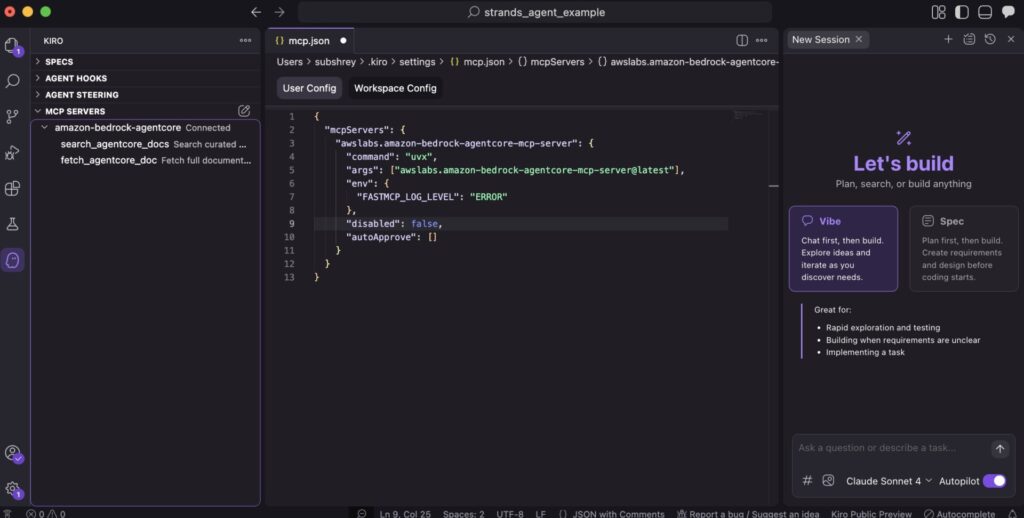 For example, here is what the IDE looks like on Kiro, with the AgentCore MCP server and the two tools, search_agentcore_docs and fetch_agentcore_doc, connected:
