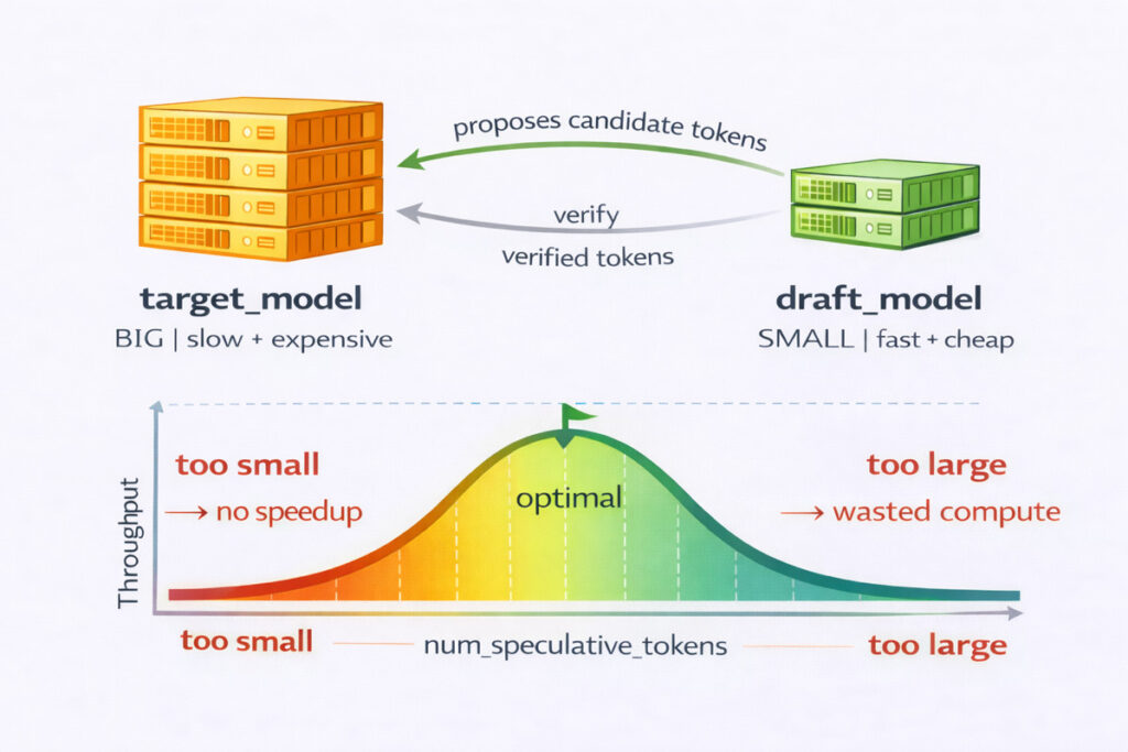 When the target model accepts the draft tokens, they are committed without incurring the full cost of sequential decode steps. The primary parameter you control is num_speculative_tokens, which sets how many tokens the draft model proposes at once. Increasing this value lets you skip more serial decode steps per verification pass, directly reducing inter-token latency when acceptance rates are high.