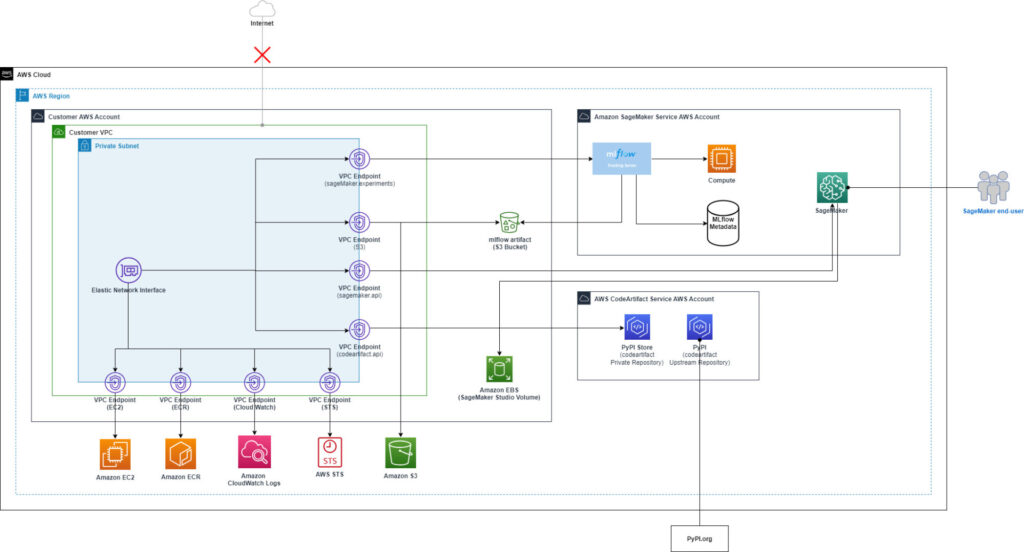 VPC endpoints, which enable the SageMaker environment to connect to other AWS services (Amazon Simple Storage Service (Amazon S3), AWS CodeArtifact, Amazon Elastic Container Registry (Amazon ECR), Amazon CloudWatch, SageMaker Managed MLflow, and so on) through AWS PrivateLink without exposing the environment to the public internet.