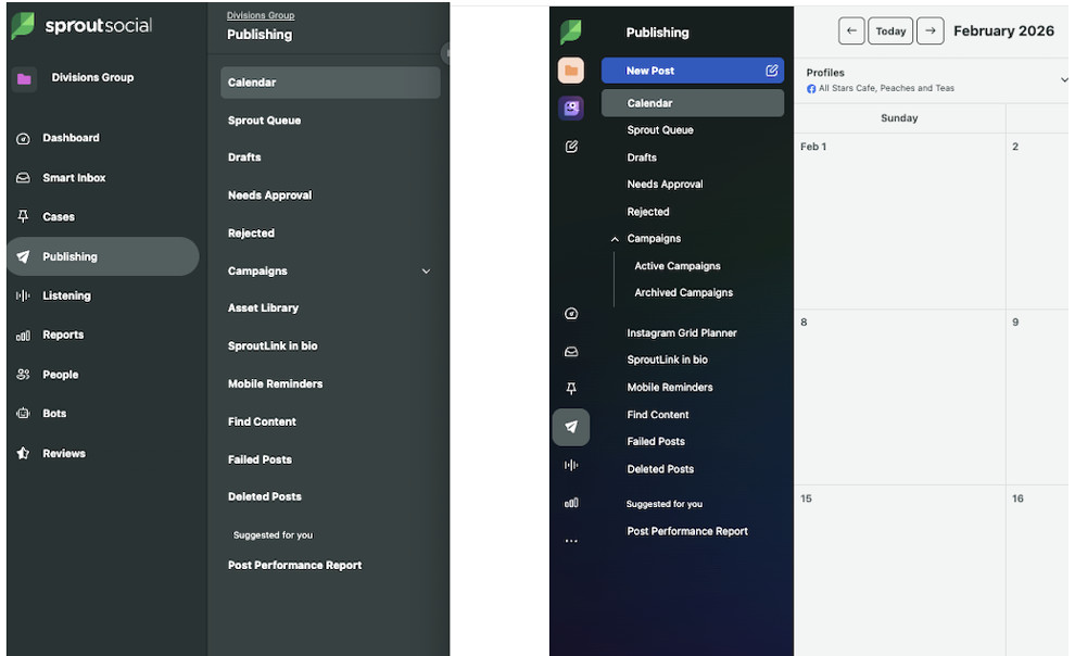 - Information architecture (IA) compression: The Sprout dashboard previously relied on a two-level hierarchy where a primary sidebar category would trigger a secondary, often fixed, sub-navigation. To flatten this without losing functionality, the Sprout engineering team implemented collapsible accordions and hover-to-reveal states within the left rail. This enables users to maintain a flat visual look while still having deep access to nested features like specific Report types or Inbox tags.