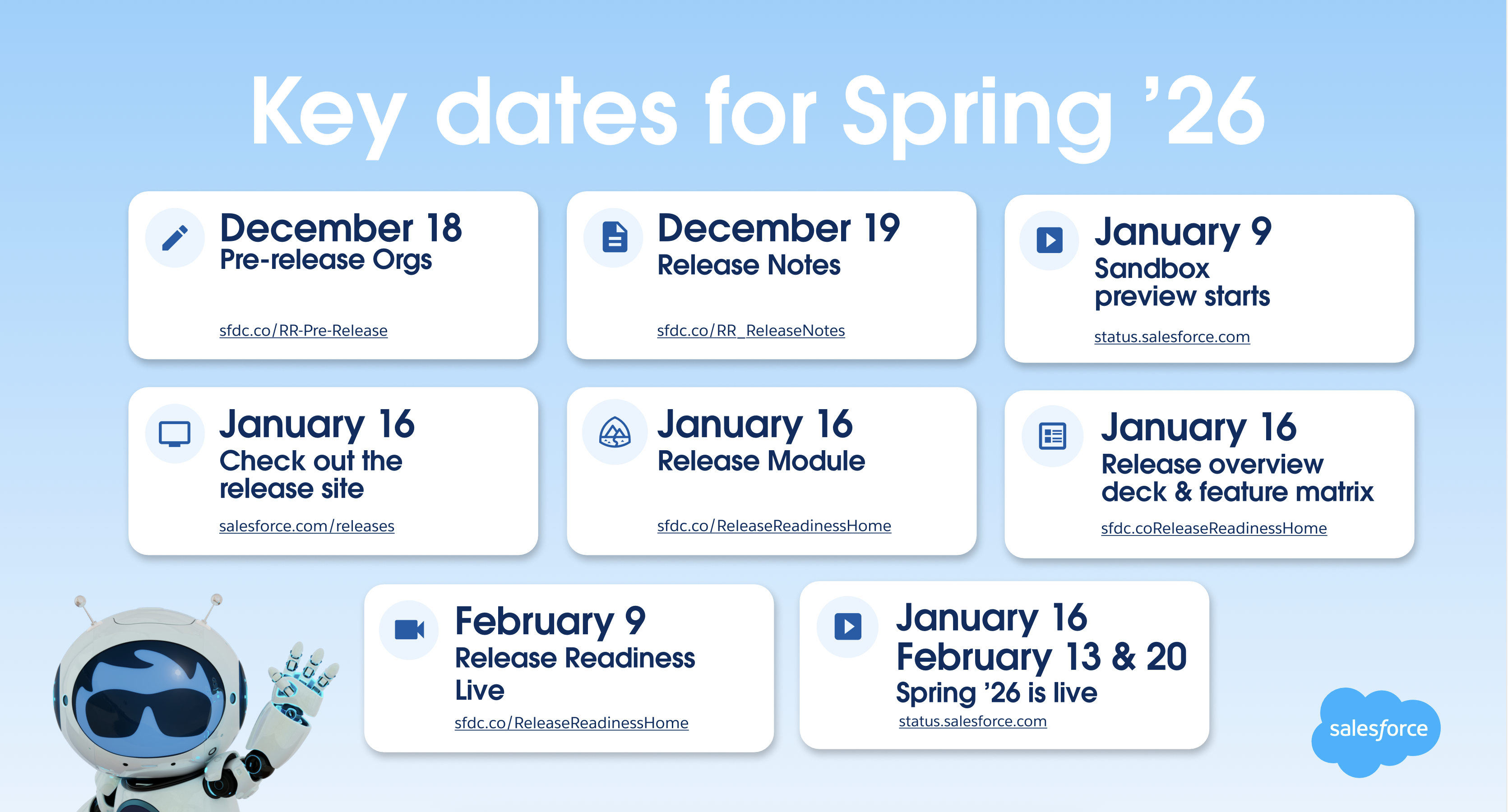 As blog posts and more release resources become available, we’ll be updating the Be Release Ready page with all the resources and information you need to get started with Spring ’26.