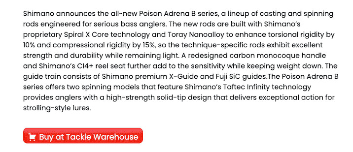 Clicking the “Buy at Tackle Warehouse” button for the Shimano Poison Adrena B Series fishing rod will send readers to a retail site via this affiliate link: