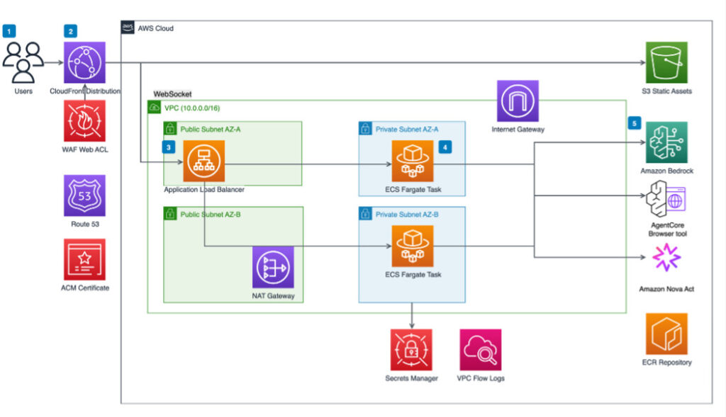 - Application integrates with Amazon Bedrock and Amazon Nova Act for AI-powered order automation. AgentCore Browser Tool provides secure, isolated browser environment for web automation. Main Agent orchestrates Nova Act Agent and Strands + Playwright Agent for intelligent browser control.