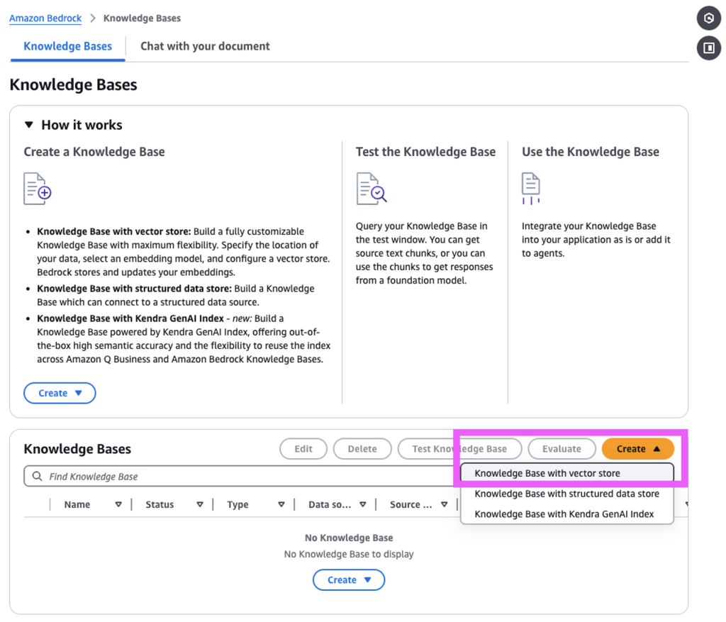 - In the Knowledge Bases section, choose Create and Knowledge Base with vector store.