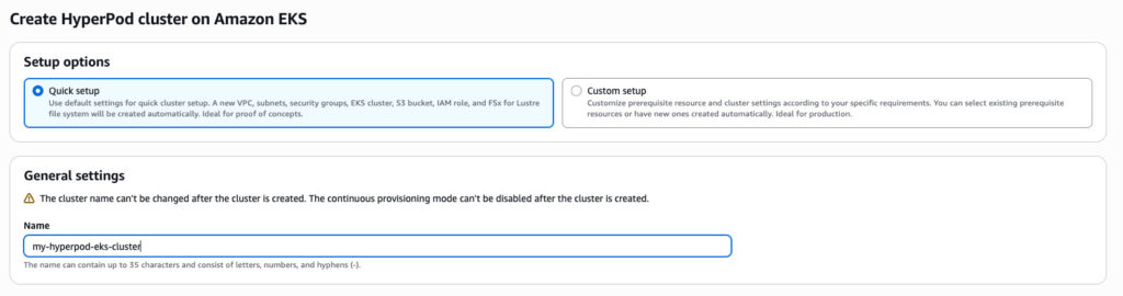 For Amazon EKS orchestration, quick setup creates a new EKS cluster using the latest supported Kubernetes version with available operators enabled, including the EFA, Neuron, and NVIDIA device plugins; the health monitoring agent (HMA); the Kubeflow training operators; and the SageMaker HyperPod inference operator.