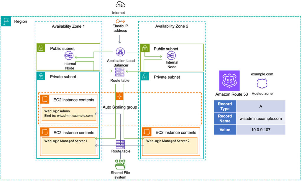 We deploy WebLogic in multi-Availability Zone (multi-AZ) active-active stretch architecture. For this simple example, there is only one WebLogic domain and one admin server. To meet this requirement, we: