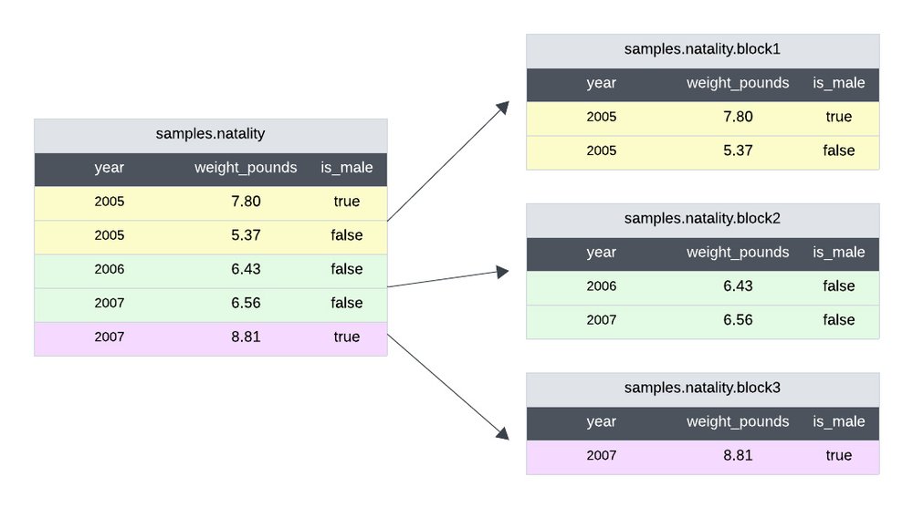 To illustrate how the index serves queries in practice, let’s use the `natality` table from BigQuery’s public dataset. Imagine this table’s data is stored in three blocks (see Figure 1), committed at times 110, 120, and 130. Our column metadata index, with a snapshot taken at time 125, includes block- and column-level statistics for blocks 1 and 2.
