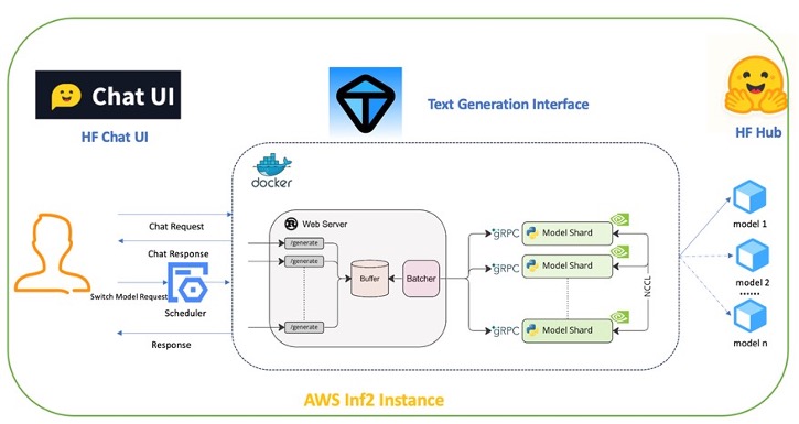 The solution uses a client-server architecture, and the client uses the HuggingFace Chat UI to provide a chat page that can be accessed on a PC or mobile device. Server-side model inference uses Hugging Face’s Text Generation Inference, an efficient LLM inference framework that runs in a Docker container. We pre-compiled the model using Hugging Face’s Optimum Neuron and uploaded the compilation results to Hugging Face Hub. We have also added a model switching mechanism to the HuggingFace Chat UI to control the loading of different models in the Text Generation Inference container through a scheduler (Scheduler).