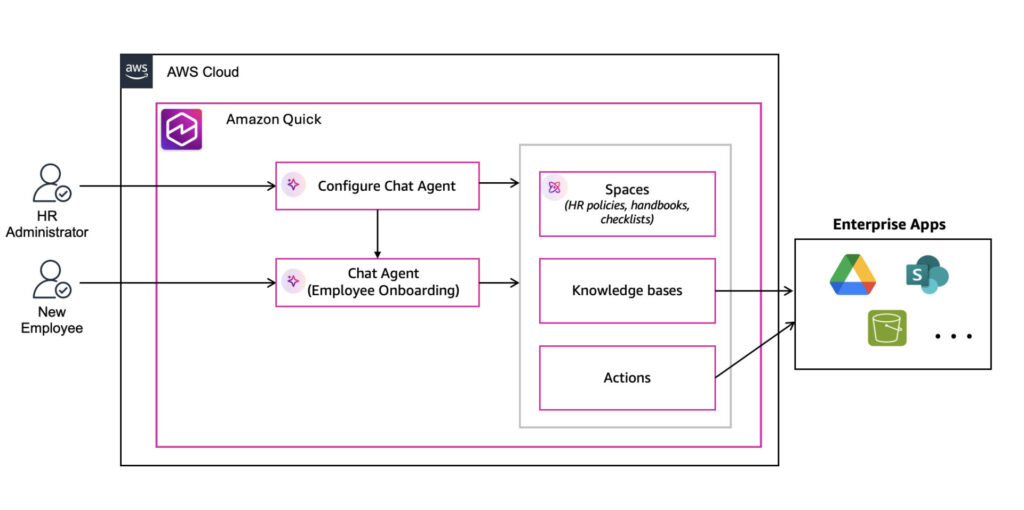 In this post, we walk through building a custom HR onboarding agent with Quick. We show how to configure an agent that understands your organization’s processes, connects to your HR systems, and automates common tasks, such as answering new-hire questions and tracking document completion. You can adapt this solution to your onboarding workflow so new hires get consistent answers and HR teams reclaim time previously spent on routine inquiries.