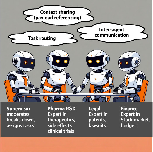 In this post, we discuss how to build a multi-agent system using multi-agent collaboration to solve complex business questions faced in a fictional biopharmaceutical company that requires expertise and data from three specialized domains: R&D, legal, and finance. We demonstrate how data in disparate sources can be combined intelligently to support complex reasoning, and how agent collaboration facilitates open-ended question answering, such as “What are the potential legal and financial risks associated with the side effects of therapeutic product X, and how might they affect the company’s long-term stock performance?”