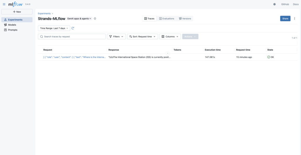 Now that you’ve created an MLflow App, you enable automatic logging for Strands Agents so that the agent interactions, tool usage, and performance metrics are automatically captured and sent to the MLflow App without requiring manual instrumentation.
