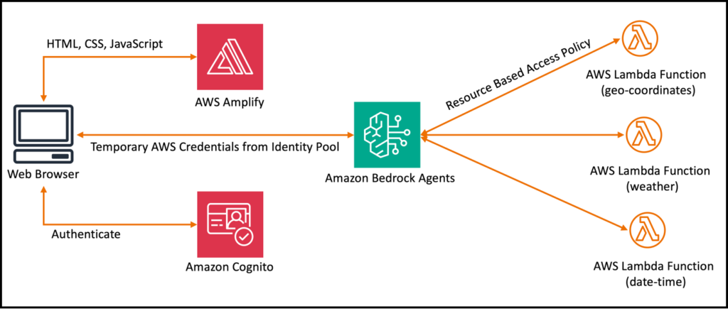 In this post, we present a streamlined approach to deploying an AI-powered agent by combining Amazon Bedrock Agents and a foundation model (FM). We guide you through the process of configuring the agent and implementing the specific logic required for the virtual meteorologist to provide accurate weather-related responses. Additionally, we use various AWS services, including AWS Amplify for hosting the front end, AWS Lambda functions for handling request logic, Amazon Cognito for user authentication, and AWS Identity and Access Management (IAM) for controlling access to the agent.