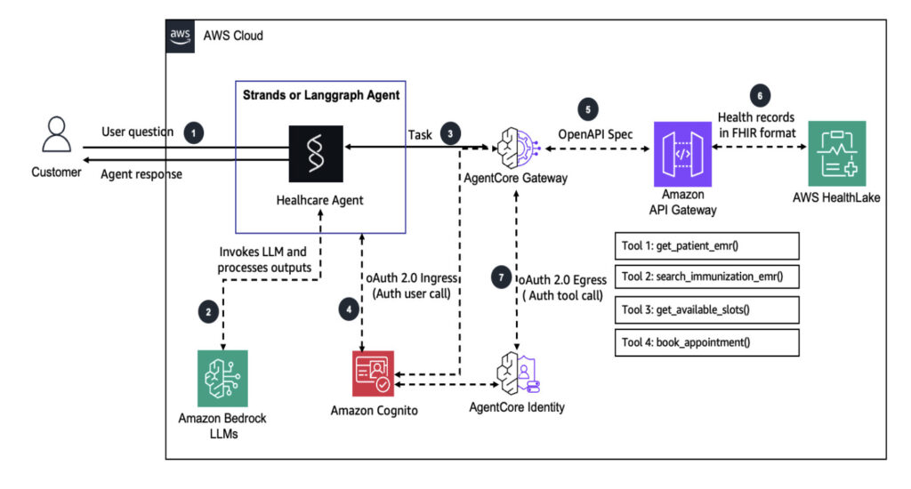 Health care demands precision and accountability. AI agents operating within this domain must handle sensitive patient data securely, adhere to rigorous compliance regulations (like HIPAA), and maintain consistent interoperability across diverse clinical workflows. Standard, generalized protocols fall short when dealing with complex healthcare systems and patient data protection requirements. Healthcare organizations need a robust service to convert their existing APIs into Model Context Protocol (MCP) compatible tools that can scale effectively while providing built-in authentication, authorization, encryption, and comprehensive audit trails. Amazon Bedrock AgentCore Gateway offers health care providers and digital health companies a straightforward and secure way to build, deploy, discover, and connect to tools at scale that they can use to create AI-powered healthcare solutions while maintaining the highest standards of security and compliance.