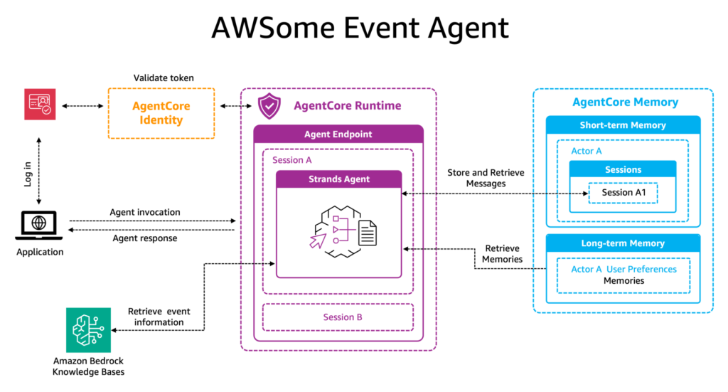 This post demonstrates how to quickly deploy a production-ready event assistant using the components of Amazon Bedrock AgentCore. We’ll build an intelligent companion that remembers attendee preferences and builds personalized experiences over time, while Amazon Bedrock AgentCore handles the heavy lifting of production deployment: Amazon Bedrock AgentCore Memory for maintaining both conversation context and long-term preferences without custom storage solutions, Amazon Bedrock AgentCore Identity for secure multi-IDP authentication, and Amazon Bedrock AgentCore Runtime for serverless scaling and session isolation. We will also use Amazon Bedrock Knowledge Bases for managed RAG and event data retrieval.