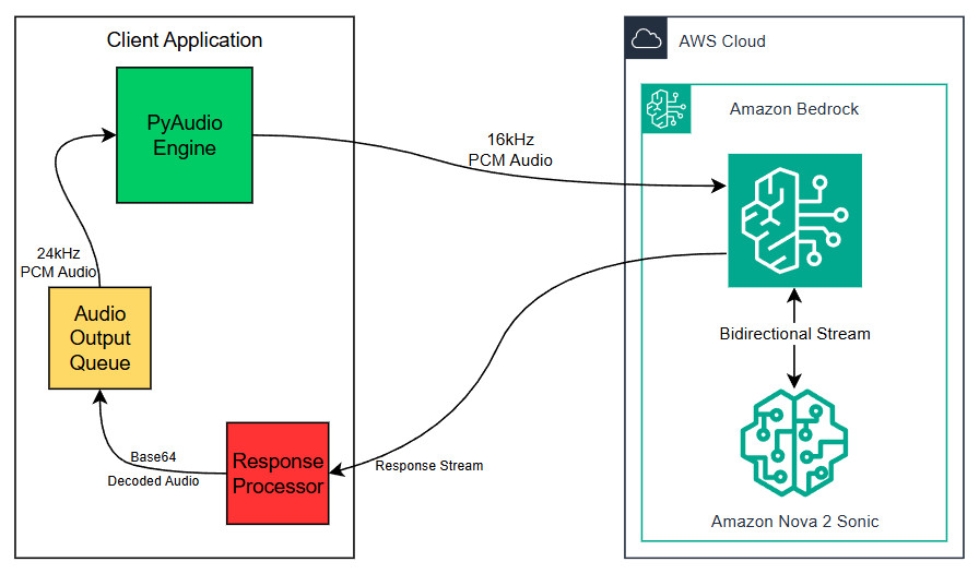 • Amazon Bedrock receives the outbound 16kHz PCM audio stream from the PyAudio Engine and routes it to the model. It also carries the model’s response stream back to the client.