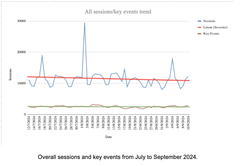 We examined their Google Analytics 4 (GA4) and Google Search Console (GSC) data to assess organic trends and overall traffic patterns.