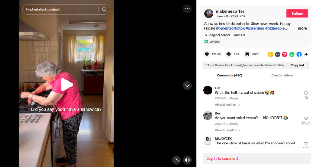Alex Dodman creates “real reviews” of popular UK tourist destinations that poke fun at the UK as a whole, as well as at himself. This reveals another key trend about UK TikTok–that what sounds like negativity can, in the right situations, create a positive response. Pulling this type of content off does however demand an understanding of how UK comedy works.