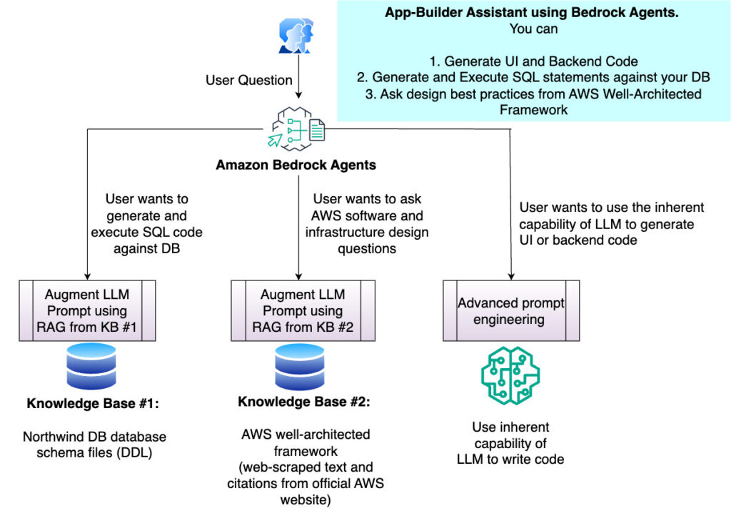 The following diagram illustrates how our application builder assistant acts as a coding assistant, recommends AWS design best practices, and aids in SQL code generation.
