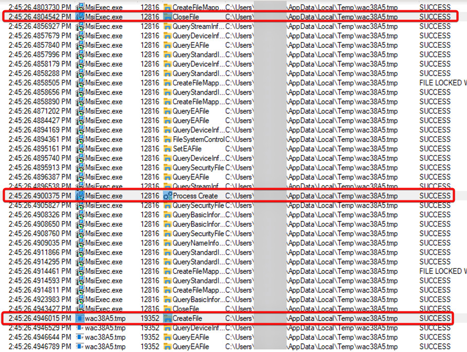 Figure 1: MSIExec.exe copying and executing .tmp file in user’s %TEMP% folder