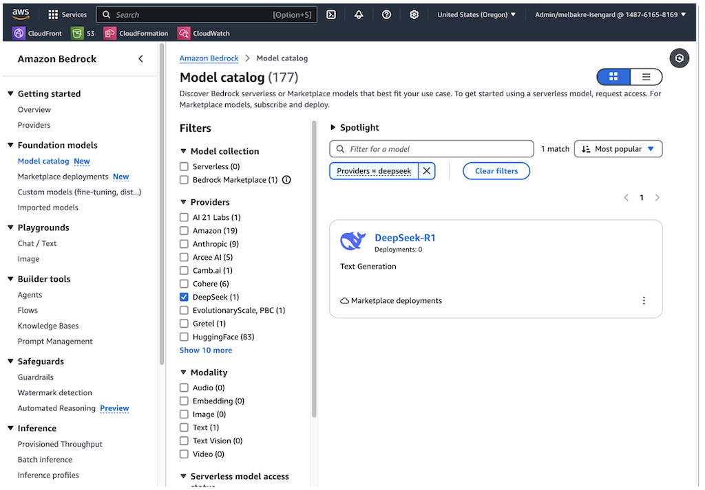 Amazon Bedrock Marketplace gives you access to over 100 popular, emerging, and specialized foundation models (FMs) through Amazon Bedrock. To access DeepSeek-R1 in Amazon Bedrock, complete the following steps:
