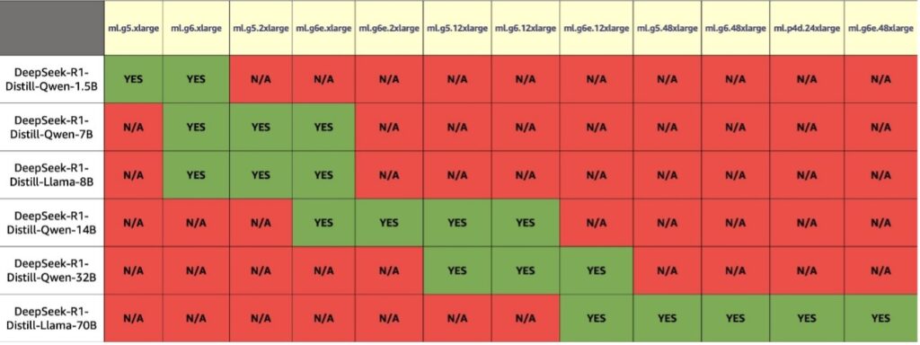 • Hardware – We tested the distilled variants on a variety of instance types ranging from 1, 4, or 8 GPUs per instance. In the following table, a green cell indicates that a model was tested on that particular instance type, and red indicates that a model wasn’t tested with that instance type, either because the instance was excessive for a given model size or too small to fit the model in memory.