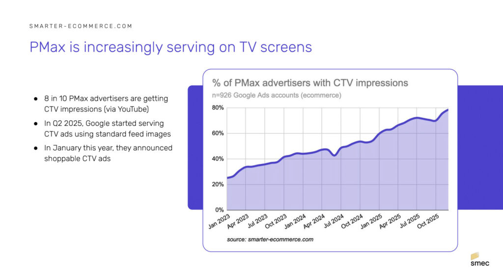 Eight in ten Performance Max advertisers are receiving connected TV (CTV) impressions via YouTube, as reported by Smarter Ecoommerce’s Mike Ryan. Google has expanded the channel’s reach over the past year — and the trajectory is only accelerating.