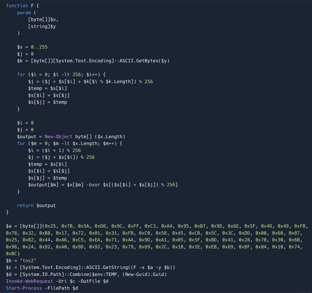 Obfuscation Routine: The script defines a function F that performs byte-level XOR encryption using a key derived from the string “tox2”. This function is used to deobfuscate the malicious URL.