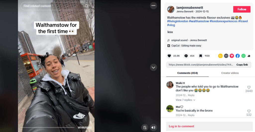 This video from creator @iamjennabennett uses specific London neighborhood hashtags to connect her interests with her location.