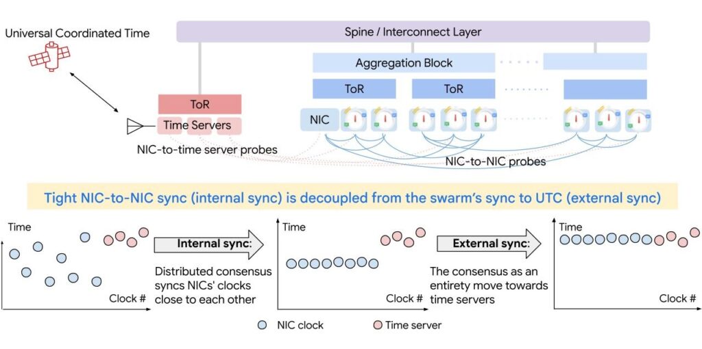 1. Layered synchronization: Firefly employs a novel layered synchronization technique. Instead of relying on a central clock, which can be a single point of failure or introduce delays, it first establishes tight internal synchronization amongst NICs within the data center. Each NIC in the network constantly communicates with a set of its peers, comparing times and making adjustments. From this “swarm” of devices emerges a highly stable and accurate consensus time that the entire group agrees upon. This internal synchronization is rapid and robust, effectively shielding it from external timing disturbances. Concurrently, Firefly synchronizes the entire swarm to UTC. Decoupling of these two processes is crucial, as it prevents external factors like time-server jitter or drift from directly impacting internal synchronization.