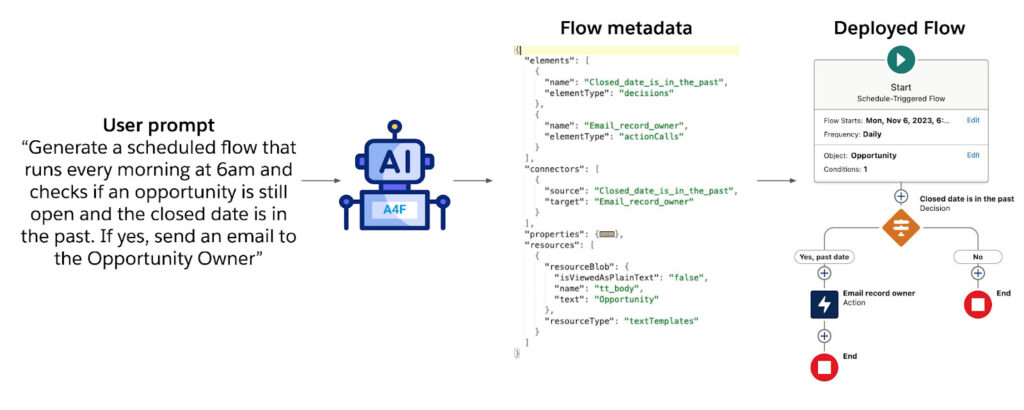 Salesforce flows sit at the heart of modern CRM automation, yet authoring them still requires a unique mix of declarative drag‑and‑drop and Apex know‑how. To ease this process, Salesforce has committed to incorporating cutting-edge Generative AI technologies such as Agentforce for Flow (A4F, now generally available). A4F uses AI to generate complete Salesforce flows from a user prompt, which can then be readily deployed on Flow Builder. These tools have already seen rapid adoption by Salesforce Admins, with thousands of unique org sign ups within the first few months.