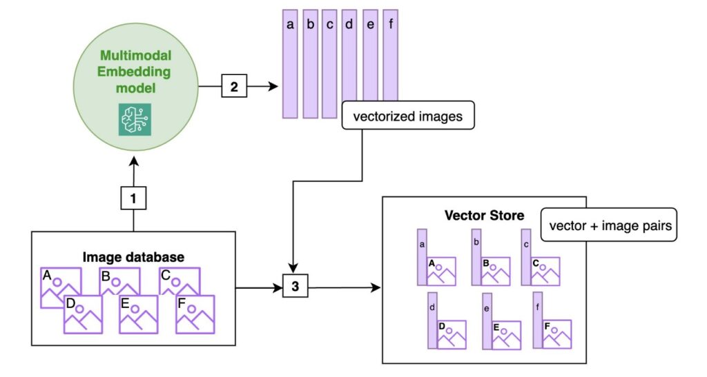 The following diagram shows the ingestion logic with a multimodal embedding. The images in the database are sent to a multimodal embedding model that returns vector representations of the images. The images and the corresponding vectors are paired up and stored in the vector database.