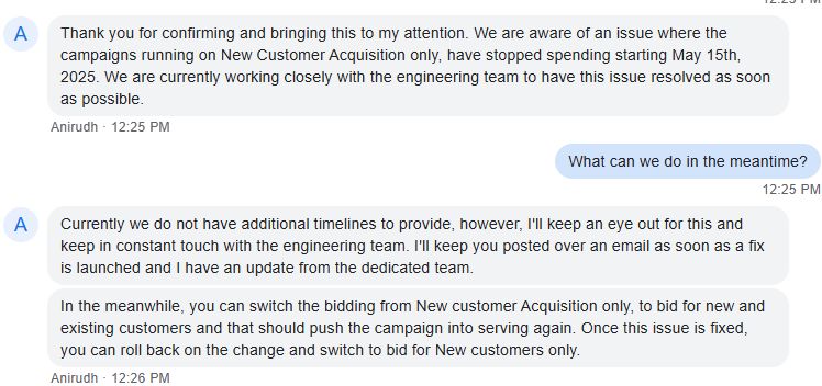 - “We are aware of an issue where the campaigns running on New Customer Acquisition only, have stopped spending starting May 15th,” Google said.