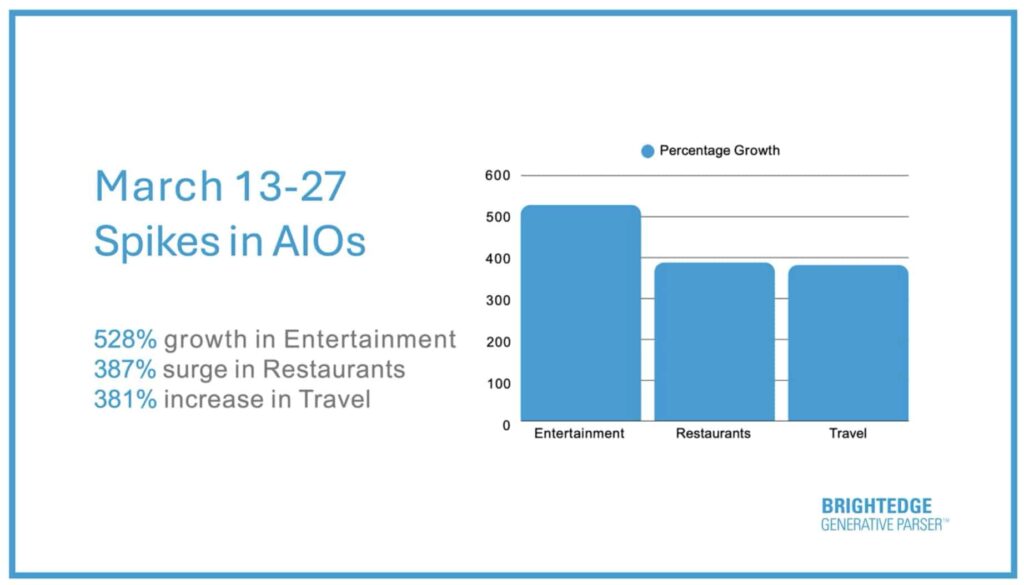 By the numbers. Between March 13 and 27, according to data shared with Search Engine Land by enterprise SEO platform BrightEdge, the presence of AI Overviews grew by: