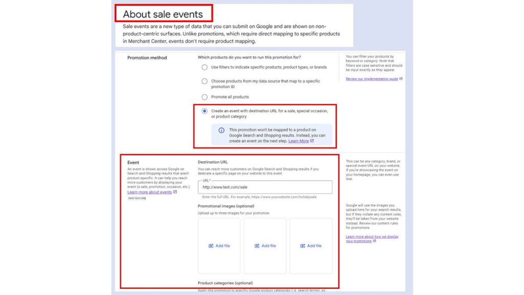 The details. Unlike standard promotions that must be tied to individual products, the “Sale Event” promotion allows merchants to highlight general sales and discounts, such as “All items up to 70% off.”
