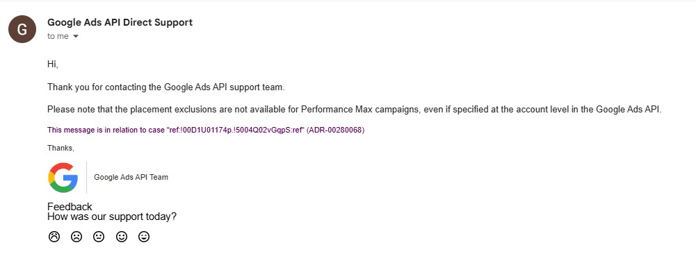 Behind the scenes. Google’s documentation and AI help center had explicitly stated that placement exclusions would only work through their user interface, not via API.