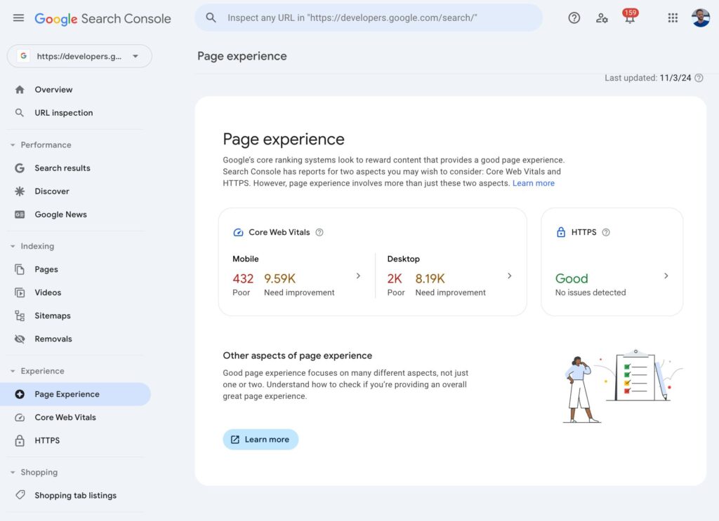 We decided to remove this page to reduce unnecessary clutter within Search Console and simplify navigating to this information. We still encourage you to focus on providing a good page experience to your readers and monitoring the status of your sites page experience in the CWV and HTTPS reports.