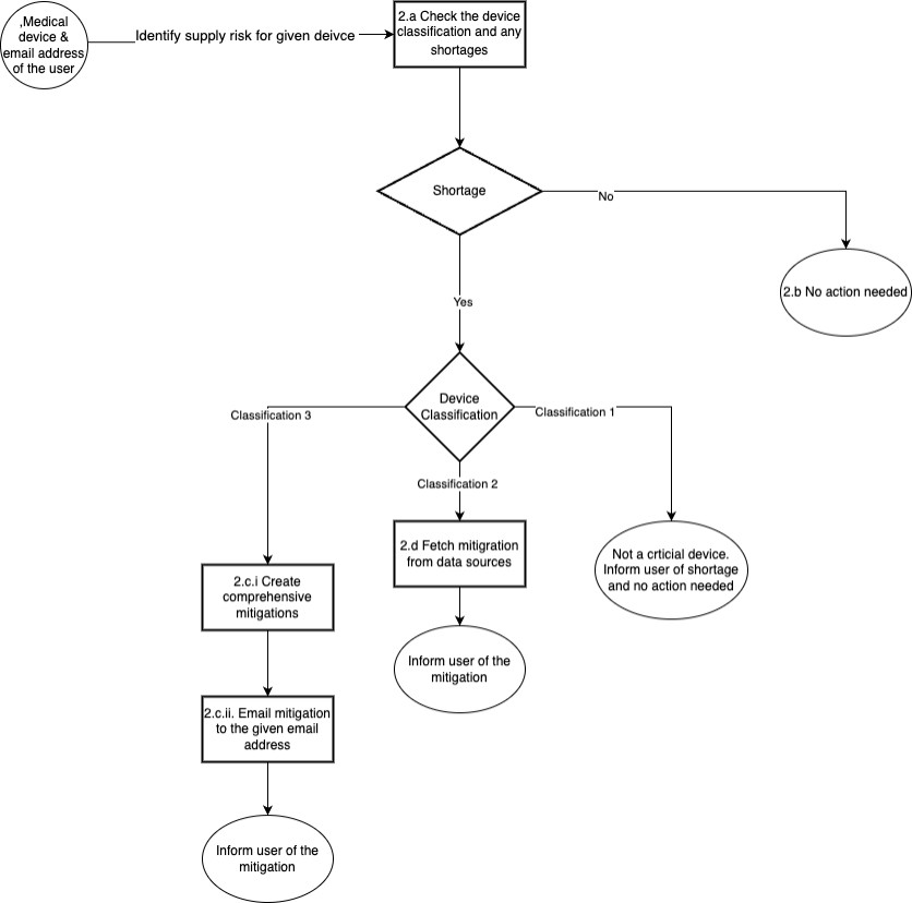 - If the device classification is 2 (medium-risk medical devices that can pose harm to patients) and there is a shortage, the flow lists the mitigation steps as output. Classification device 2 doesn’t require a comprehensive mitigation strategy. We recommend to use these when the information retrieved fits the context size of the model. Mitigation is fetched from Amazon S3 directly.