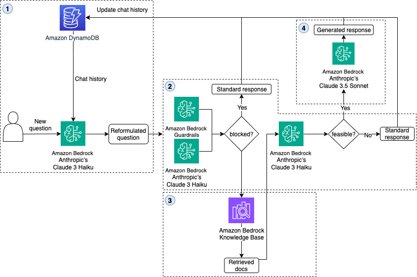 1. Follow-up question module – This module enables follow-up question answering by contextual conversation handling. Chat histories are stored in DynamoDB and retrieved when users pose new questions. If a chat history exists, it is combined with the new question. The LLM then processes it to reformulate follow-up questions into standalone queries for downstream processing. The module maintains context awareness while recognizing topic changes, preserving the original question when the new question deviates from the previous conversation context.