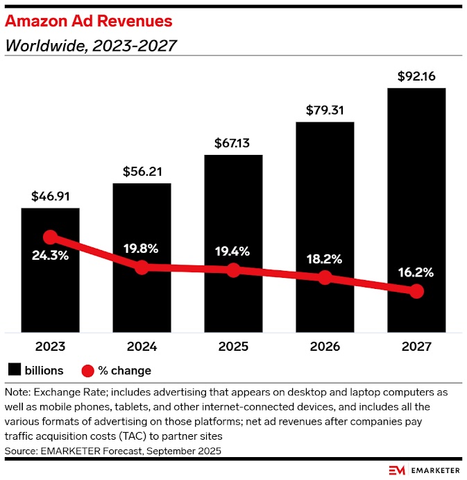Recently revised eMarketer figures suggest the e-commerce giant’s advertising division will generate $67 billion in 2025, up almost a fifth from the previous year, and is projected to top $90 billion within two years, with services such as Amazon Marketing Cloud and its demand-side platform key to this growth.