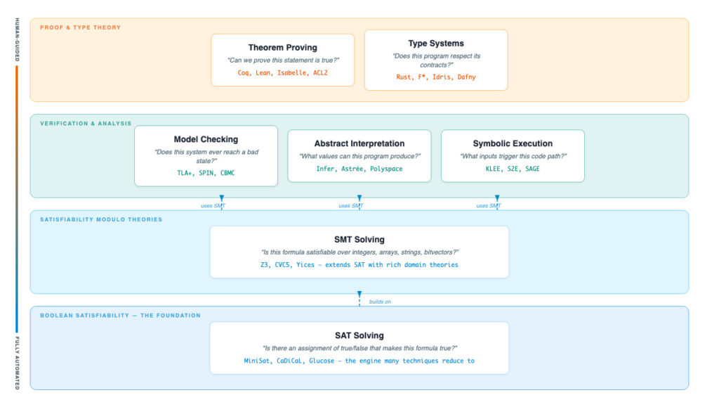 Figure 1: Automated Reasoning taxonomy, including Theorem Proving, Type Systems, Model Checking, Abstract Interpretation, Symbolic Execution, SMT Solving, and SAT Solving. SAT and SMT solving form the foundation of Automated Reasoning checks