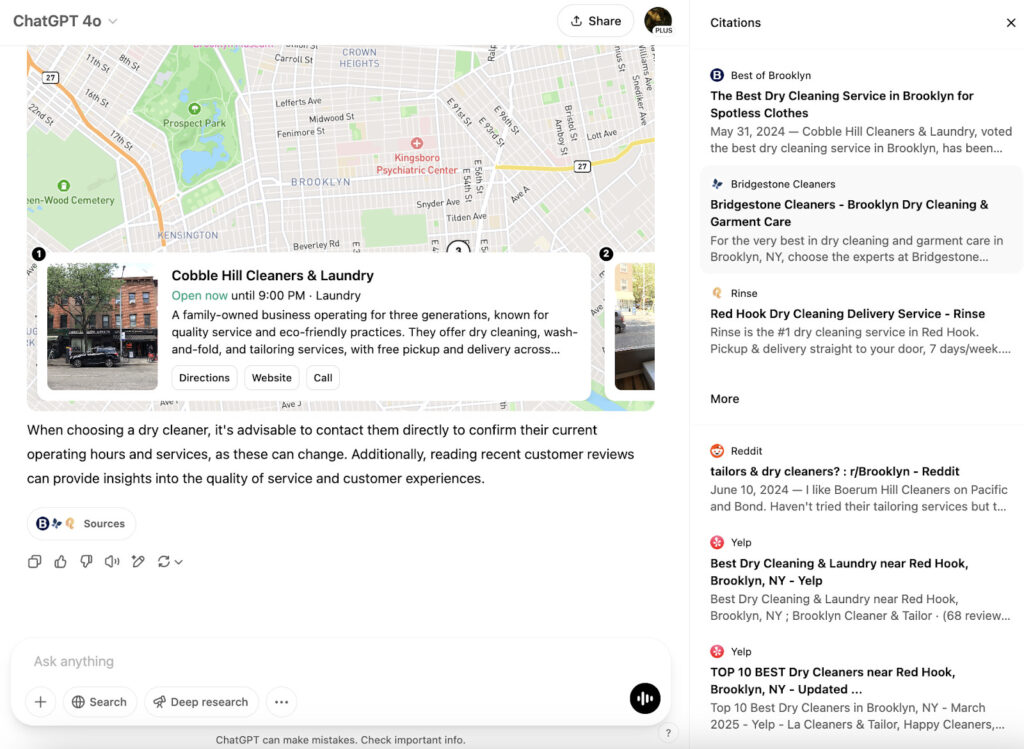 When I asked ChatGPT to suggest dry cleaners in Red Hook, Brooklyn that are open on Sundays, I got back a map and three listings, not unlike a local pack on Google.